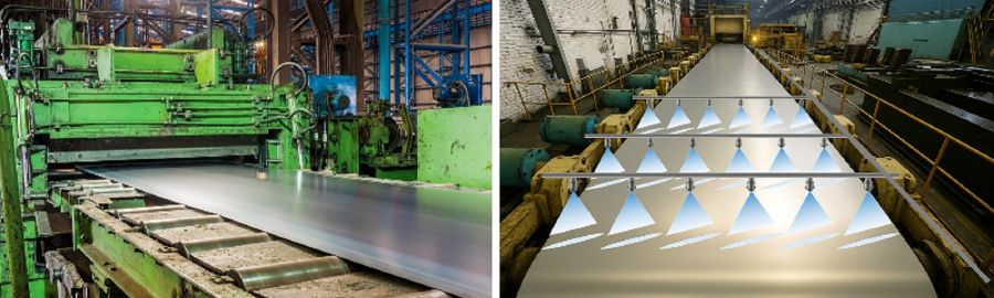 冷轧钢板表面处理——包括酸洗、碱洗脱脂、漂洗等工序,都离不开扇形喷雾喷嘴(扁平喷雾)。这是因为,对于移动的工件,单个扇形喷雾喷嘴就能覆盖较大面积。
