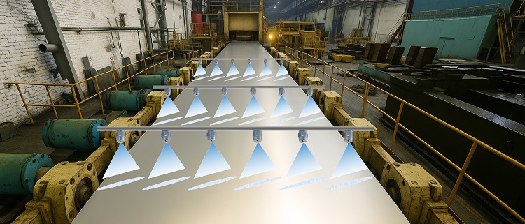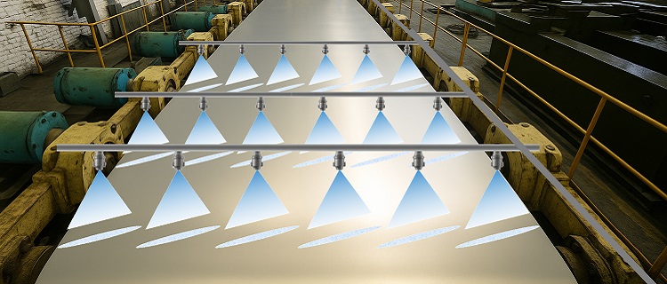 然而,由于冷轧钢板的宽度可达约2米,实际使用时需将多个喷嘴安装在喷头上。安装时,喷嘴并非在宽度方向上水平排列,而是设置一定的扭转角度,使扇形喷雾图案的两端与相邻图案重叠,从而在整个宽度范围内形成均匀的喷雾分布。