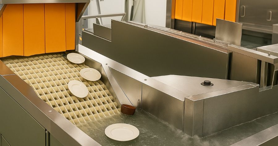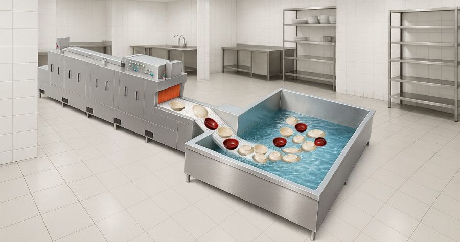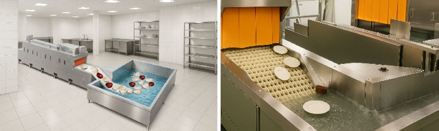 该设备的要求是需通过足够的水流将餐具冲走,避免其在水槽内滞留。然而,要实现这一点需要大流量的泵,这不仅涉及节能问题,还会导致设备体积庞大,给根据员工食堂的规模和布局进行设计带来了很大障碍。