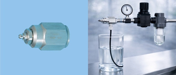 接到咨询后,负责该业务的销售人员选择了将压缩空气与防静电剂混合,实现药液雾化的2流体喷雾喷嘴。为了覆盖整个生产线宽度,销售人员将目光投向了扇形喷嘴“BIMV”系列,并最终选定了具备通过压缩空气吸起药液功能(抽吸功能)的“BIMV-S”型号。