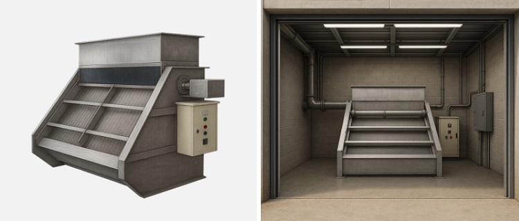 左:倾斜式楔形金属丝筛网装置|右:筛分室