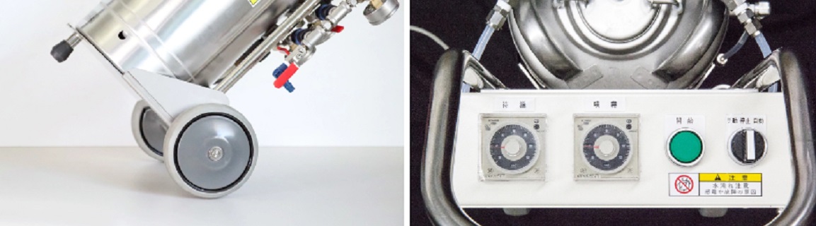 「喷雾车」是将喷雾控制箱和液体加压罐一体化的单元。属于便携式,无需安装工程。只需连接100V电源和压缩空气即可开始运转,放置位置灵活,可自由选择使用地点。