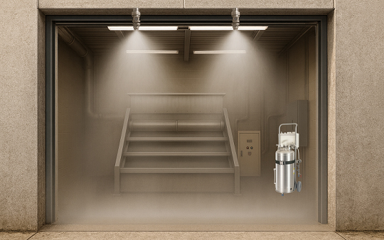 关于与此「喷雾车」组合使用的喷嘴,基于筛分室的规模,我们判断安装2个BIM即可满足需求。BIM是一种能产生微细柔和、不会打湿地面的雾气的喷嘴。我们在筛分室入口、高度4米处安装了2个,设计了旨在抑制恶臭并防止其扩散到室外的布局。