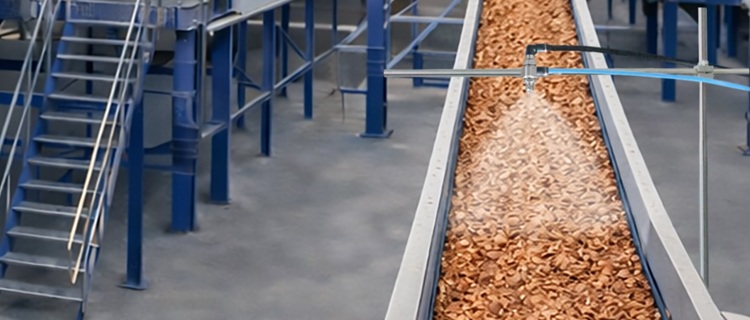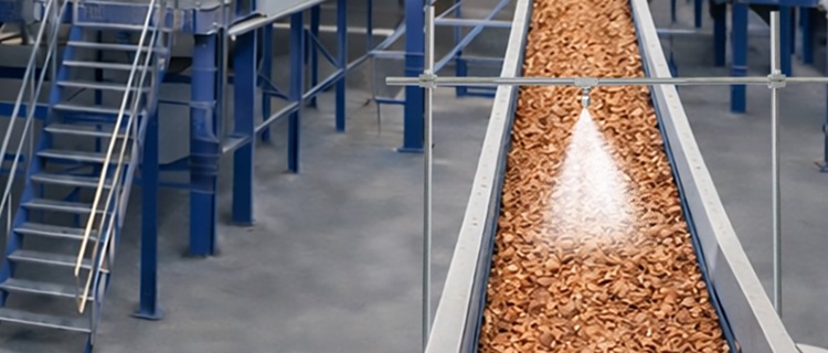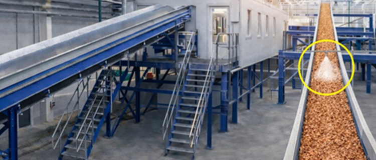 该设施为了抑制经细粉碎的废弃物产生粉尘,在输送带宽度方向的中央安装了一流体喷雾喷嘴*,进行扇形喷雾。其原理是,输送物随输送带运动通过喷雾区域,表面被湿润,从而抑制粉尘飞散。